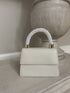 The cutest mini bag you ever did see! With a beaded statement handle and flap front closure, this bag has just enough room for just the essentials. Can be carried top handle or crossbody.