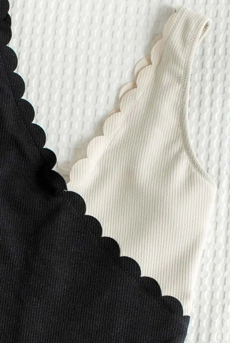 Have all eyes on you in our gorgeous Victoria swimsuit. You just can't go wrong in this sweet color block one-piece. Featuring a lovely scallop trim and open v-neck, this design adds a little flirtiness to this classic swimsuit style.